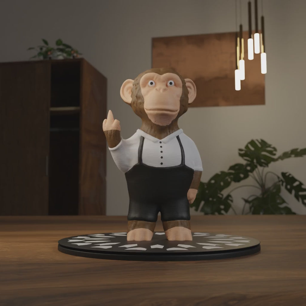 This is Archie the Ape 🦍. Dressed sharp in his buttoned shirt and suspenders, Archie has seen enough of human manners to know he’s not impressed. Calm, collected, and with that heavy stare, he doesn’t waste words, just one raised finger to make his point.